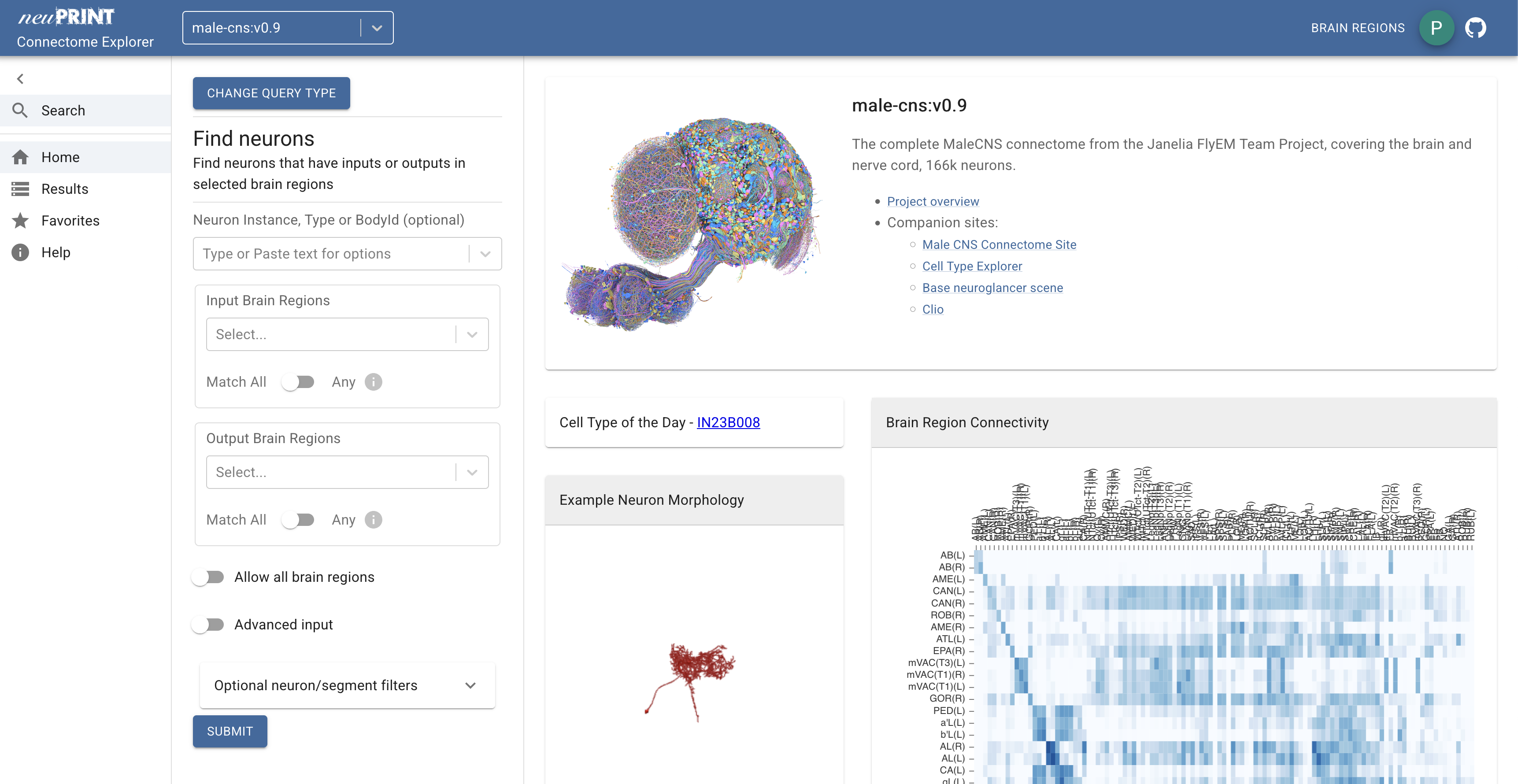 NeuPrint is a web-based platform for interactively exploring connectome data. You can search for neurons, visualize their morphology, and analyze their connectivity.